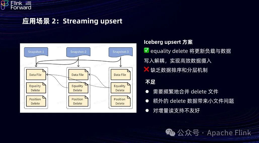 在上述两种传统方式之外,还探索过使用 Iceberg Upsert 的方案。Flink 支持以 Upsert 的方式写入 Iceberg。在写入过程中,Iceberg 通过 Equality Delete 的 Position Delete 文件将更新操作与数据写入解耦,把数据合并和负载转移到读取和 Compaction 阶段。这种方式的优点是可以实现高效的数据摄入。