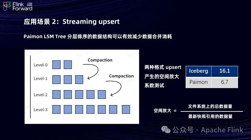 经过对比测试,通过使用两种数据表写入同一批数据进行 Upsert 测试,并使用 Compaction 任务保持两个表的 Delta Delete 文件不超过一定阈值,以测试空间放大的问题。测试结果显示,Paimon 的 Compaction 产生的空间放大远低于 Iceberg,具体数值大约是 16.1 比 6.7。