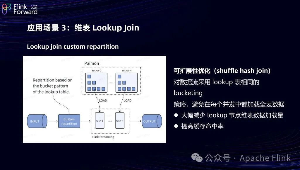 在分析该问题时,我们发现之所以需要加载全量数据,是因为没有对流表进行合适的数据分区。通过对数据流采用与 Lookup 表相同的 Bucket 策略,可以有效避免在每个并发操作中加载全表数据的问题。优化后的系统能够自动进行分区,这样每个节点只需加载特定 Bucket 的数据,大幅减少了单个 Lookup 节点的数据加载量。