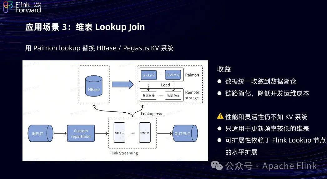 可扩展性依赖:Paimon 的可扩展性依赖于 Lookup 节点的水平扩展。与 KV 系统不同,KV 系统只需扩展其存储资源,而使用 Paimon Lookup 则需要扩展 Flink 的计算节点,甚至可能需要重新划分 Paimon 的 Bucket 并增加其数量。