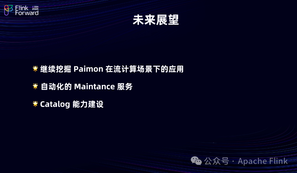 最后看一下未来的展望。后续计划是继续深入挖掘 Paimon 在流计算场景中的应用,希望能将其推广到更多用户和使用案例中。目前已经有几个典型的应用场景,但仍希望能进一步拓宽其使用范围。