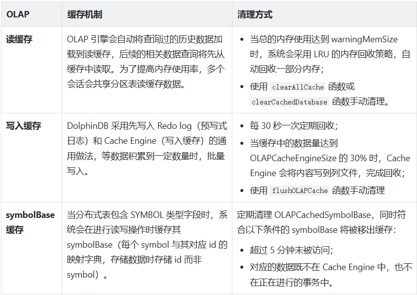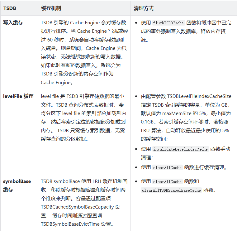 从 2.00.11 和 1.30.23 版本开始,维度表引入了自动回收机制,当内存使用超过系统配置参数 warningMemSize 设定的阈值时,系统会根据 LRU(Least Recently Used)策略尝试释放部分维度表缓存; 从 2.00.11 和1.30.23 版本开始,clearAllCache 函数也可以清理维度表缓存; 调用 clearCachedDatabase 手动释放维度表缓存。