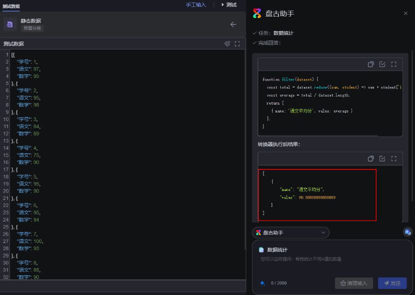 华为云 Astro 大屏应用盘古助手支持自然语言交互,你只需要问一句:“帮我统计出语文科目的平均分”或者“统计一下用户活跃度”,它就能秒懂你的需求,帮你快速完成数据筛选和统计。数据处理从未如此简单!