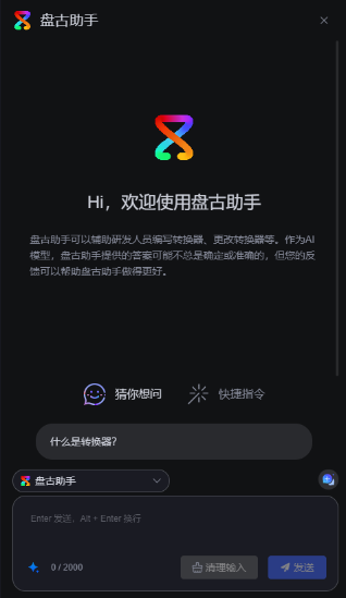 华为云 Astro 大屏应用盘古助手是由华为研发的基于盘古大模型的 AI 助手,它能够快速生成转换器代码,帮助您将数据接入大屏,并擅长回答各类通用问题。无论是编程、技术咨询还是其他领域的问题,华为云 Astro 大屏应用盘古助手都能为您提供准确、逻辑性强且友好的回复。