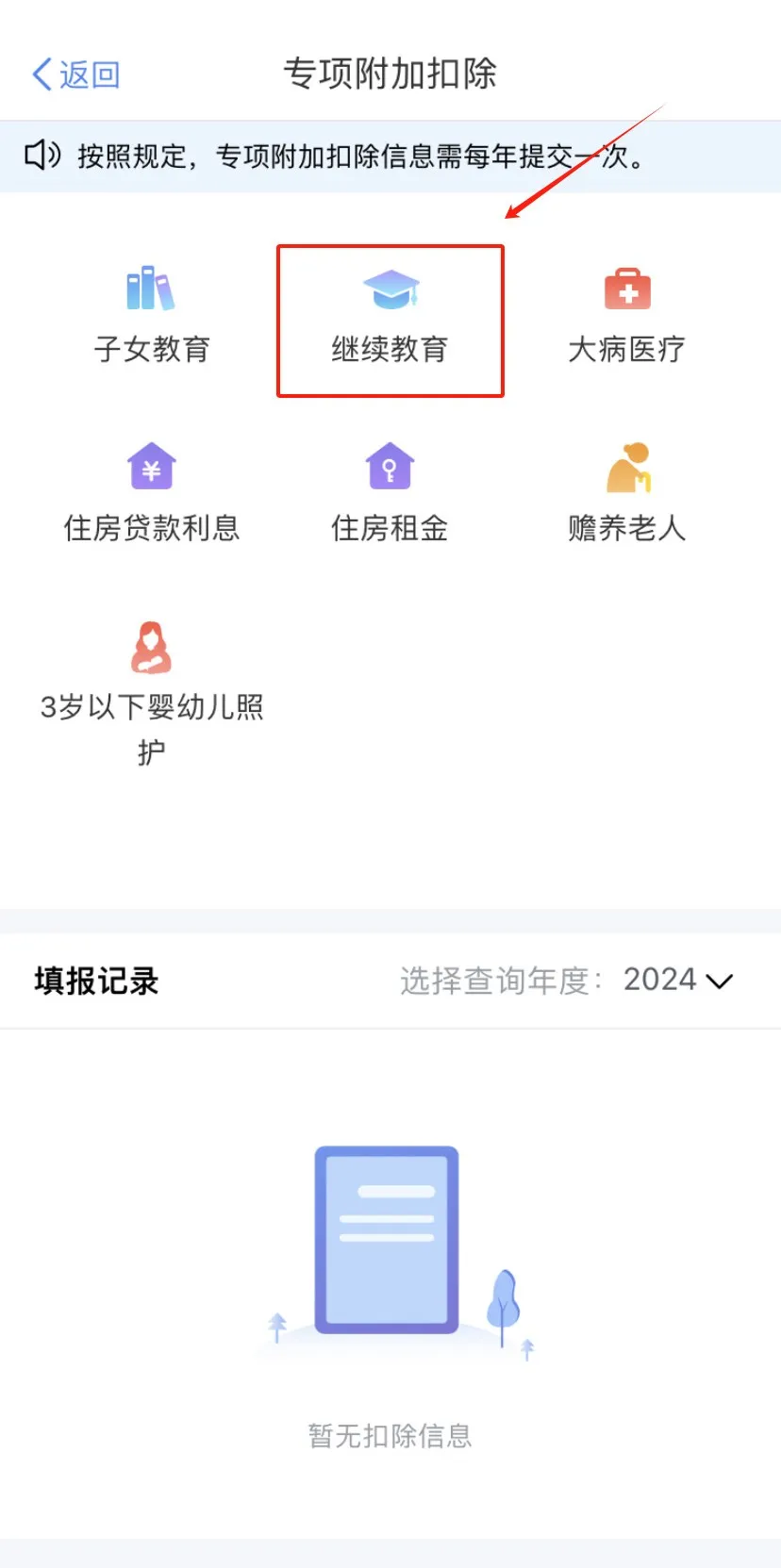 - 第二步,在专项附加扣除页面点击“继续教育”