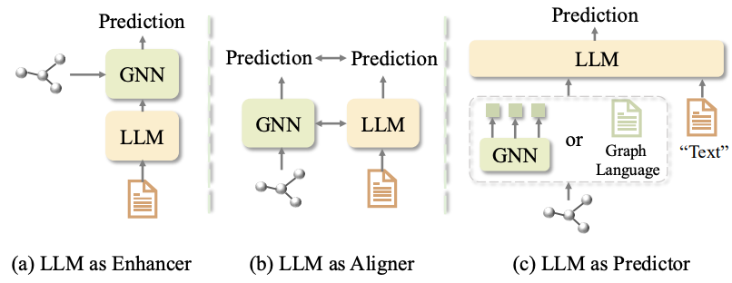 结合 LLMs 的 TAG 方法大致可以分为三类(图1所示)[1]:LLM 作为增强器(LLM as Enhancer)、LLM 作为预测器(LLM as Predictor)、LLM 作为对齐器(LLM as Aligner)。