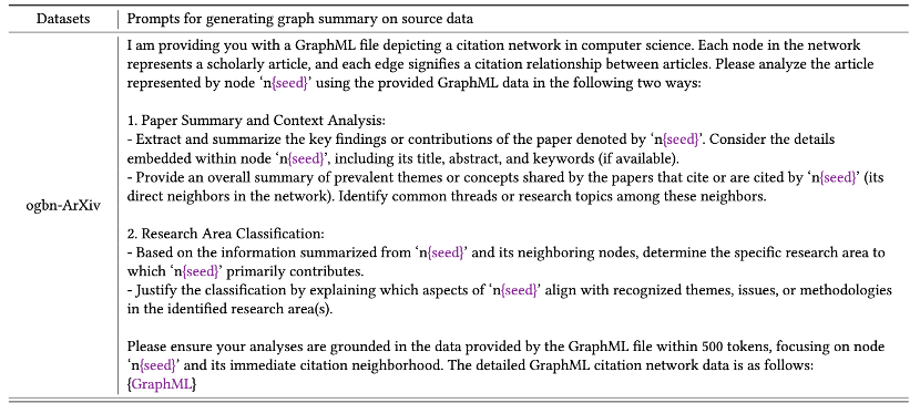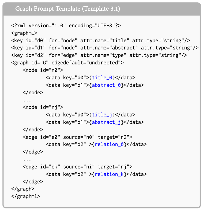 为了解决上述挑战,我们充分利用大语言模型(LLMs)出色的摘要能力,生成与图相关的摘要,从而构建图-摘要对数据。具体而言,我们采用 GraphML 图标记语言[8],并精心设计提示模板(图2),以增强 LLMs 对输入图的理解能力。这一方法利用了 LLMs 在标记语言处理上的优势,将图结构数据转换为序列数据输入大模型。