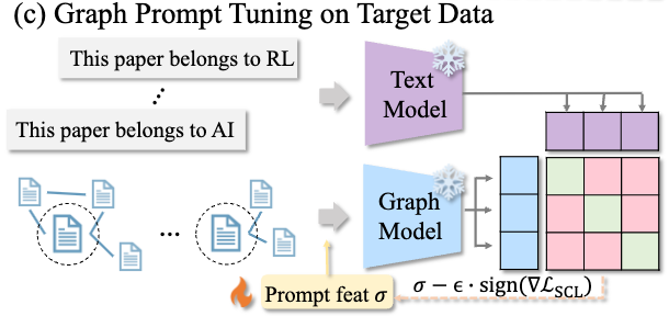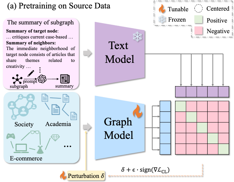 在“LLM 作为对齐器”的范式中,研究的重点是将图和文本模态映射到共享的嵌入空间,从而实现跨模态的知识对齐。例如,ConGrat[6] 和 G2P2[7] 采用自监督的图-文本对比预训练方法,专注于在同一图内迁移预训练模型。然而,这些方法通常忽略了跨域或跨图的迁移能力,导致其在处理异源数据时表现有限。