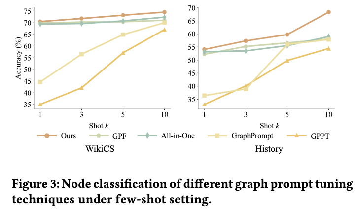从上图可见,GPPT 和 GraphPrompt 在1-shot 和3-shot 设置下表现较差,主要这些方法需要额外训练 class tokens,无法利用文本模型直接推理。然而,随着样本数增加至5-shot 和10-shot,这些方法的性能逐渐接近其他基线。