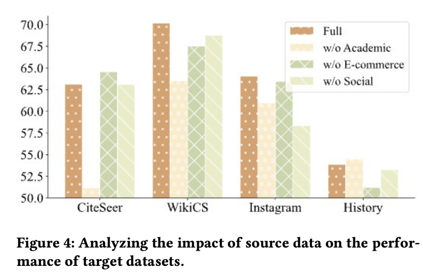 本节研究了源数据选择对跨域和域内迁移能力的影响。通过屏蔽不同源域,在 CiteSeer(学术)、WikiCS(维基)、History(电商)和 Instagram(社交)数据集上评估性能。其中,“Full”表示使用全部源数据;“w/o Academia”排除了学术数据;“w/o E-commerce”排除了电商数据;“w/o Social”排除了社交数据。