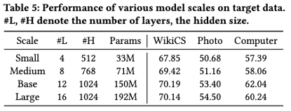 本节将对模型规模的影响展开研究。针对图模型,我们构建了四种规模:Small(4层,隐藏层512)、Medium(8层,768)、Base(12层,1024)和 Large(16层,1024)。上表显示,Base 模型的性能优于较小的模型,归因于参数规模的优势。然而,Large 模型虽在部分情况下略有提升,但伴随显著的计算开销,且在某些数据集上表现下降。因此,综合考虑性能与效率,我们选用 Base 模型作为主要实验配置。