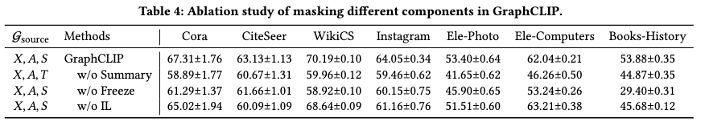 本节将逐一消融 GraphCLIP 的不同组件:“w/o Summary”使用原始文本代替生成摘要;“w/o Freeze”不解冻文本模型;“w/o IL”移除不变性学习。