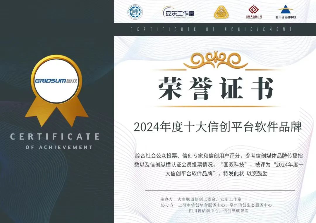 在这次评选中,国双成功获选“2024年度十大信创平台软件品牌”,这代表着信创行业、权威机构对国双多年在数智软件平台产品自主可控、安全可靠方面所做的大量投入、以及所取得的进展表示认可和鼓励。