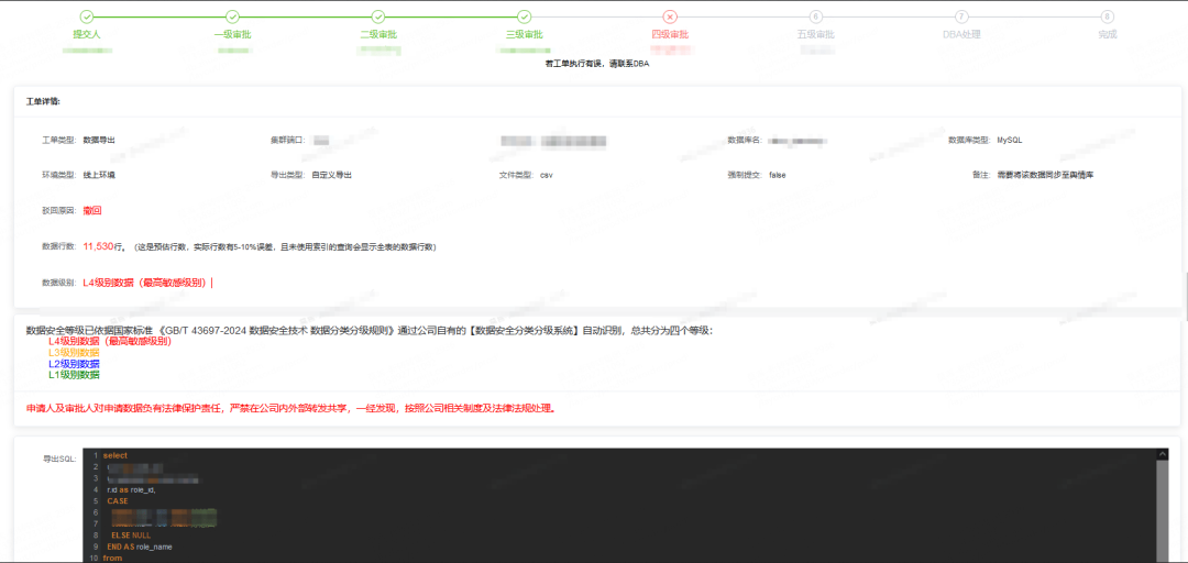 数据导出工单 会根据执行计划结果的预估行及数据敏感等级综合评估,然后给一个最终等级。依赖导出数据条数的判断是参考了相关法律法规。
