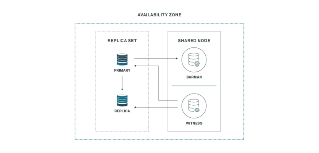 在这个特定示例中,集群只有两个数据库节点:主节点及其物理流副本。第三个节点由两个组件共享: