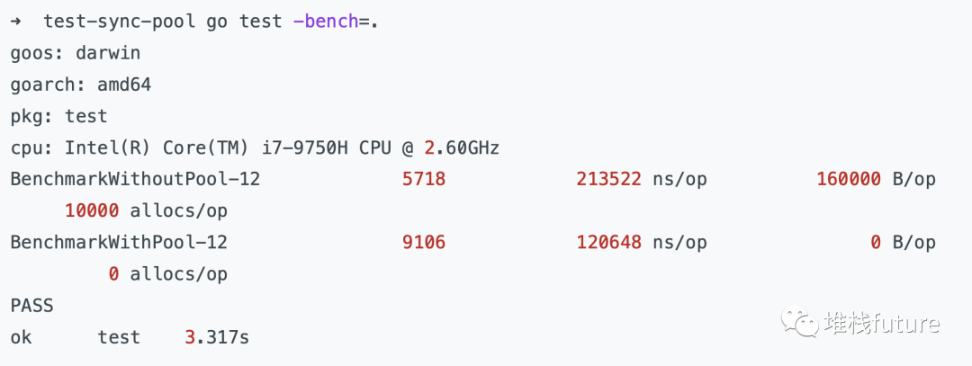 我们可以看到当程序中频繁申请对象的时候,利用Sync.Pool对象池化技术比不使用Pool技术的程序性能高出两倍