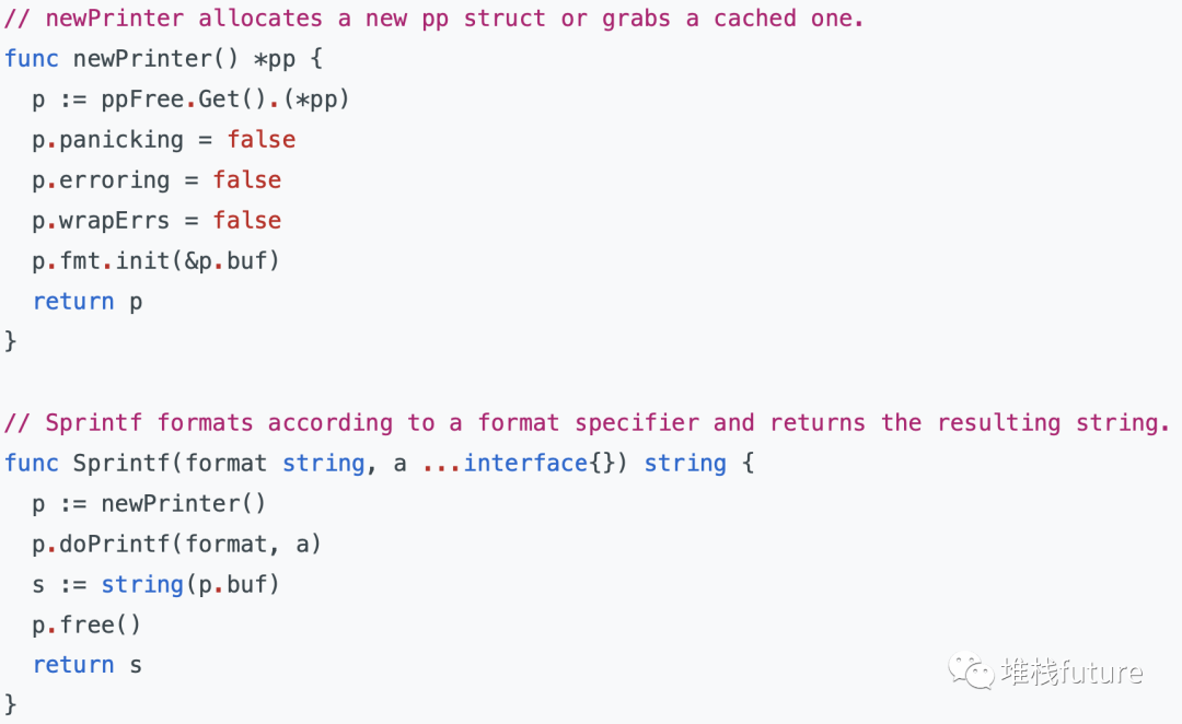 ppFree通过Get方法获取一个对象,在Sprintf中使用这个对象,使用完成之后调用free释放掉,即归还给Pool中。
