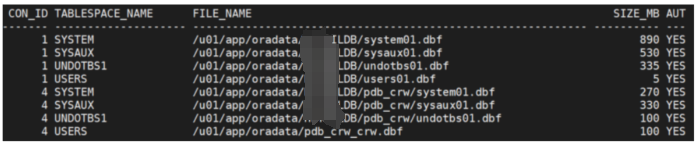 select con_id,tablespace_name, file_name, bytes/1024/1024 as size_mb, autoextensible from cdb_data_files;
