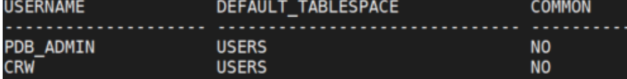 select username,default_tablespace,common from DBA_USERS where username in ('PDB_ADMIN','CRW');