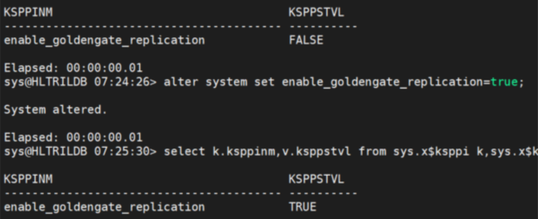 select k.ksppinm,v.ksppstvl from sys.x$ksppi k,sys.x$ksppsv v where k.indx=v.indx and upper(k.ksppinm) = 'ENABLE_GOLDENGATE_REPLICATION';