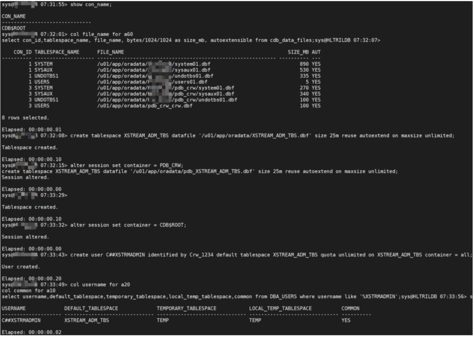 create user XSTRMADMIN identified by Crw_1234 default tablespace XSTREAM_ADM_TBS quota unlimited on XSTREAM_ADM_TBS;
