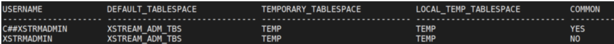 select username,default_tablespace,temporary_tablespace,local_temp_tablespace,common from DBA_USERS where username like '%XSTRMADMIN';