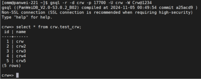 -- drop schema crw cascade; --如果有删除重建schema,需要重新做下个步骤的授权