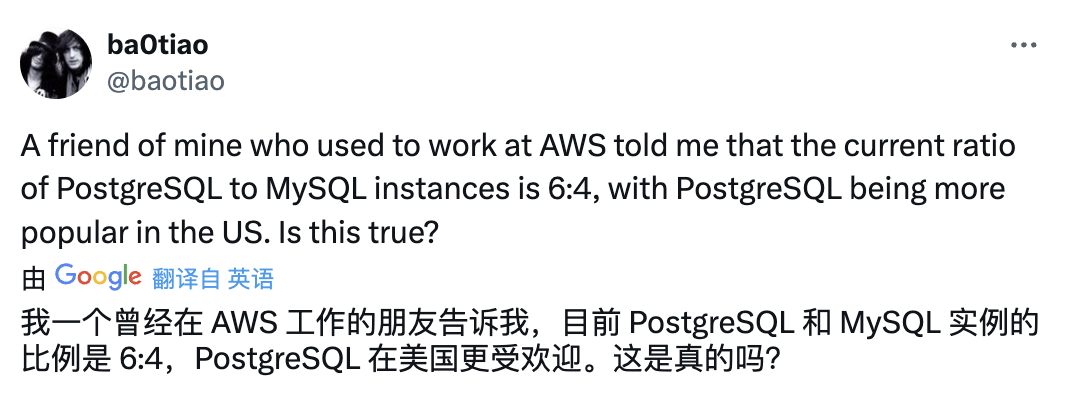 当然,在去年 PGCon.Dev 上我也特意问了 AWS 的人,他们没说具体的比例,但告诉我无论是按实例数量算还是按 CPU 数量算,PostgreSQL 都已经比 MySQL 更多了。特别是 PostgreSQL 实例的平均规格要比 MySQL 大,所以如果按照 CPU 核数来算的话,PostgreSQL 就比 MySQL 多更多了。