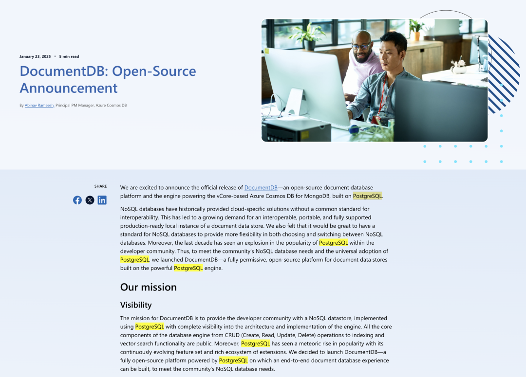 与此同时,其他公司也继续在 PostgreSQL 发力。除了先前持续维护的分布式扩展 Citus 之外,最近微软还开源了 DocumentDB,一款将 PostgreSQL 转换为 MongoDB 的扩展 —— 而且支持与 Citus 深度融合,提供分布式文档数据库的能力。