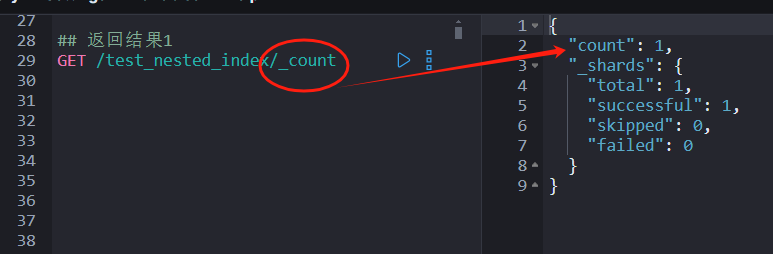 执行GET test_nested_index/_count 返回文档数:1,如下图所示。
