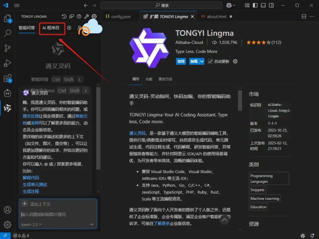 通义灵码自带两种模式,一个是智能问答模式,一个是“AI 程序员”模式,智能问答模式适合有一定编程基础的人员,“AI 程序员”模式适合什么都不会的小白。只需要打字,就能从头到尾生成想要的程序,而不写任何代码。