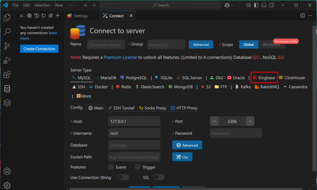 在金仓数据库技术团队的主动推动下,Database Client插件当前已正式完成对KingbaseES的适配。这意味着开发者可以直接通过该插件连接KingbaseES,享受与Oracle/PostgreSQL一致的开发体验,无需依赖第三方工具。