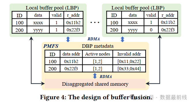 为了便于数据跨节点的快速移动,PolarDB Limitless 构建了**分布式缓冲池 (DBP),节点通过RDMA直接访问其他节点的修改数据,避免存储I/O开销。本地缓冲池 (LBP) 是 DBP 的子集,通过无效标记 (valid flag) ** 确保缓存一致性,实现高效数据传播。