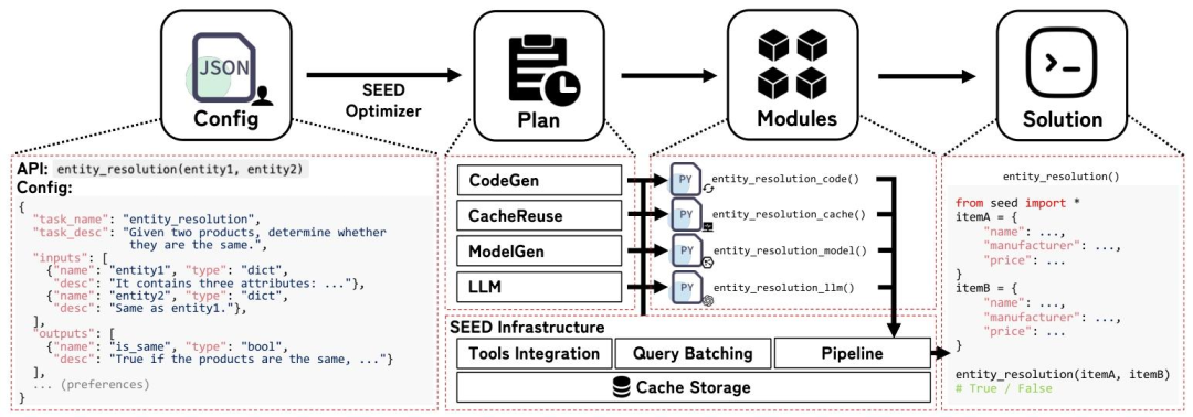 核心思想:SEED的核心思想是利用LLMs的强大能力,通过自然语言描述任务、输入数据和期望输出,自动生成一个混合执行管道。