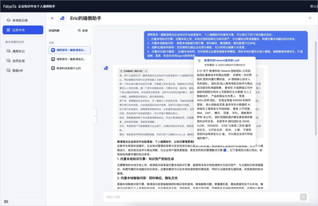 端侧助手内置强大的知识构建引擎,无需上传本地文档至服务器,即可将个人文档转化为可检索、可利用的知识资源。你的数据始终保存在自己的电脑中,避免了云端泄露的风险,隐私安全由你掌控。同时,本地知识与云端知识库无缝对接,让知识利用更加全面与高效。