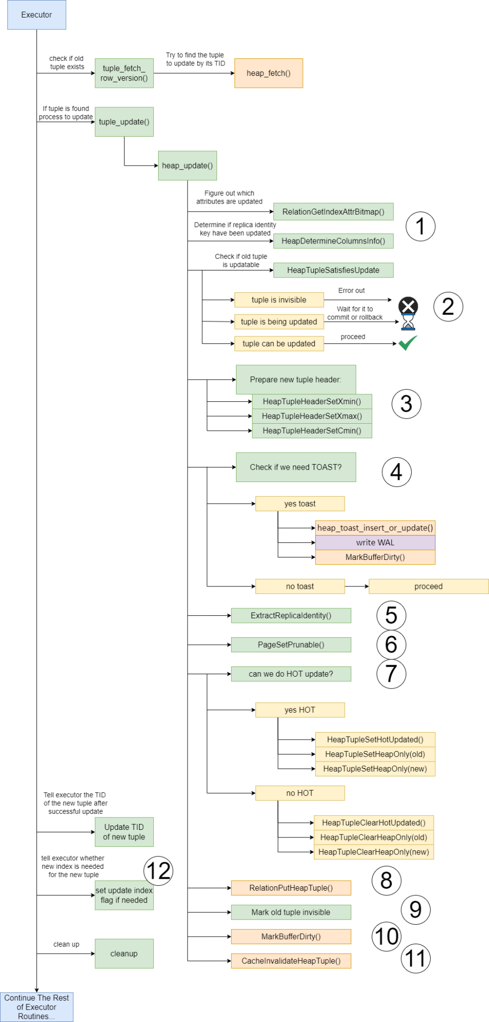 :这是处理元组更新请求的主要处理函数。此函数会接收多个参数来执行更新操作:旧元组的 TID:待更新的旧元组的位置 新元组(以 Tuple Table Slot 表示):PostgreSQL 将其转换为 HeapTuple 进行更新 命令 ID 和快照:用于对待更新的旧元组执行可见性检查