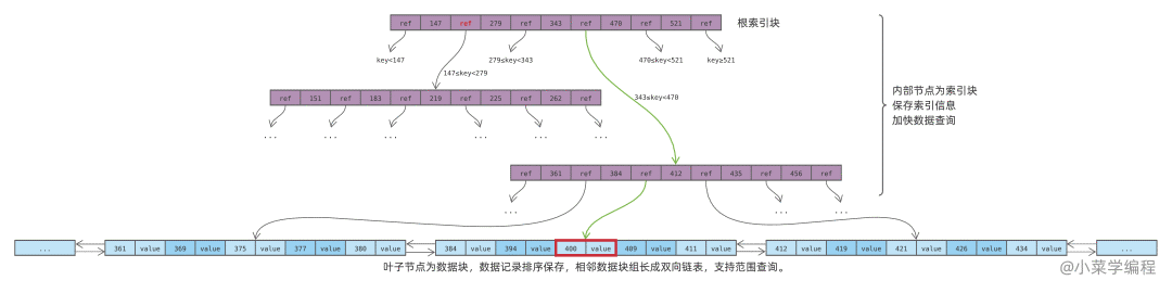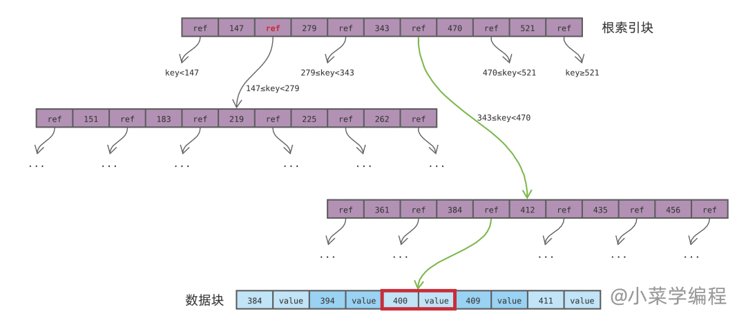 从根索引块出发,400 落在区间 [343, 470) ,根据该区间 ref 找到下一级; 来到下一个索引块,400 落在区间 [384, 412) ,根据该区间 ref 找到下一级; 最终来到蓝色的数据块,待查找的数据记录就在里面;