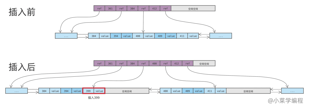 如果新记录的键相对较小,则保存在左边的数据块;否则就保存在右边的数据块。399 跟该范围的其他数据相比较小,因此保存在左边数据块。