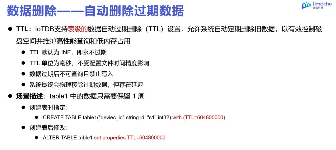 写入讲完了,下面是删除。IoTDB 的删除分成三种,一种是自动删除过期数据,一种是手动删除数据,一种是手动删除设备,这三者有什么区别呢?自动删除过期数据其实就是 TTL,这个适用场景是我们某一个 table 里面的数据只需要保留一周,那我就可以在建表的时候去指定这样一个 TTL,CREATE TABLE with (TTL=毫秒级别的精度)。你如果不指定的话,TTL 默认就是 Infinity 无穷大,就是永不过期的。