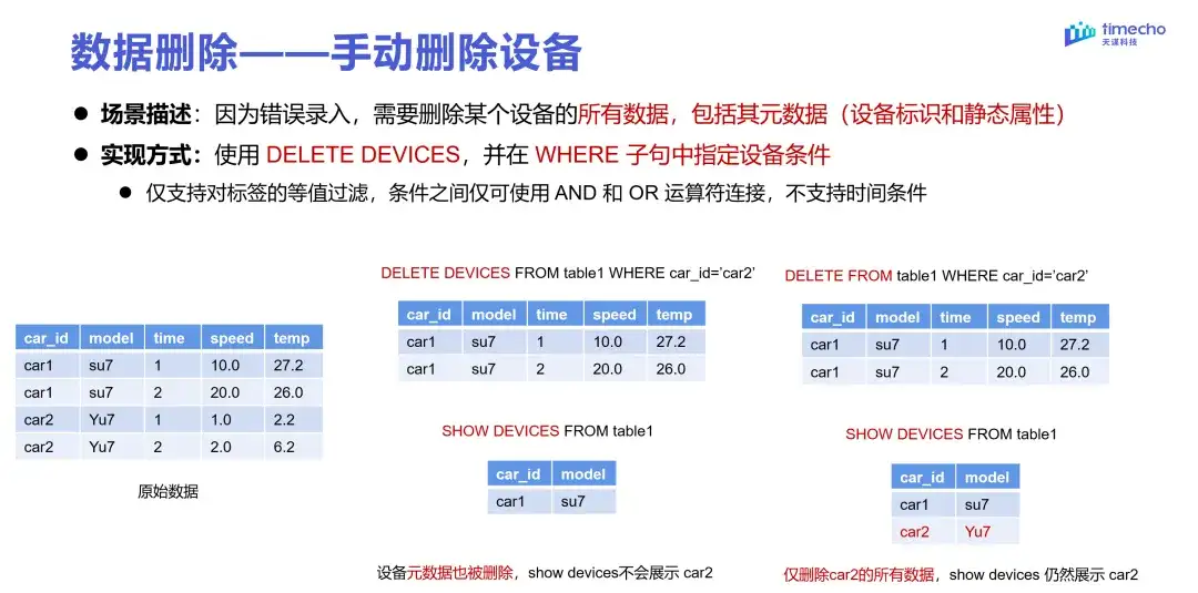还有一种方式是我直接删除整个设备,包括这个设备的元数据,这个跟 DELETE FROM 有什么差别呢?DELETE FROM 不指定时间范围也可以把这个设备的所有数据都删掉,但 DELETE DEVICES 它删得更彻底,它会删掉一些元数据,也就是设备标识和设备的静态属性,DELETE DEVICES 之后,运行 SHOW DEVICES FROM TABLE,是看不到这个设备的。比如我想要删掉 car2 这个车的所有数据,删掉之后它连 SHOW DEVICES 都不展示了,但是我如果用 DELETE FROM 这个语法,它只会删除数据,也就是会把 car2 的所有数据删掉,但是 car2 这个车还是保留着的,所以我在 SHOW DEVICES 的时候仍然能看到 car2 这个车的这条记录。这是它们俩的一个区别,DELETE DEVICES 删除会更加彻底。