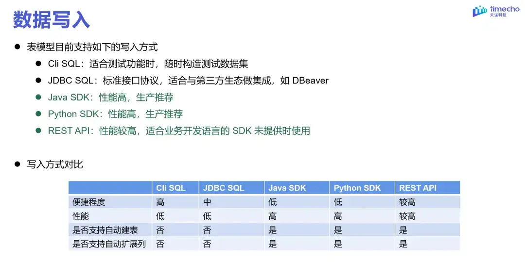 表格中也对各类写入方式的便捷程度、性能以及是否支持自动建表和自动扩展列做了一个对比,大家也可以根据这个表格去决定自己到底要用什么。这里为什么有一些是不支持的,比如 CLI SQL 和 JDBC SQL 为什么不支持自动建表和自动扩展列?因为我们的写入 SQL 是向标准 SQL 做兼容的,我们不会在 insert 里面去加入指定这一列的功能,因为只有在 insert 的 SQL 里面去指定了我插的这一列是什么类别,它到底是 TAG 列还是属性列还是测点列,我才能知道该怎么样去建这个表,但是标准 SQL 里面是不会给你指定这些的,所以 CLI SQL 和 JDBC SQL 里面就不支持自动建表和自动扩展列了。但是原生的 Java SDK、Python SDK 和 REST API,我们在设计的时候就把这些 schema 信息给带上了,让用户去指定,这样我们就可以达到自动建表和自动扩展列的效果。
