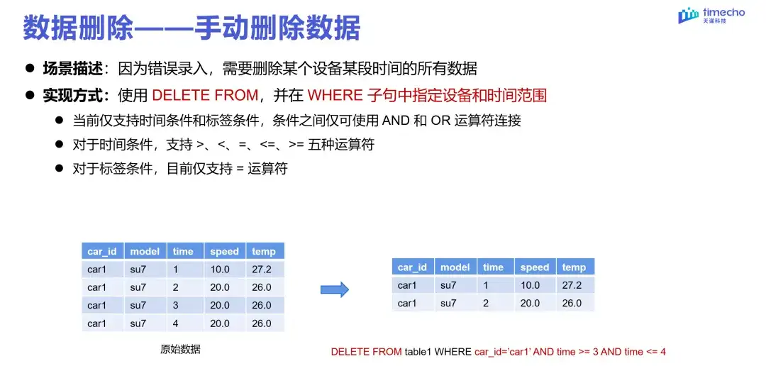 第二种就是手动删除,场景是因为我错误地录入了某一些数据,我想要手动地删掉某一个设备某一段时间内的所有数据,可以用 DELETE FROM,然后在 where 里面指定设备的过滤条件和时间范围。当前有一些限制条件,大家可以看一下下面的这个表为例,如果想删掉 car1 的 time 在 3-4 之间的数据,我就可以写一个语句,时间戳 3/4 的数据就会被删掉了。