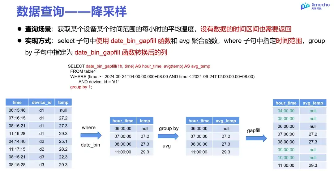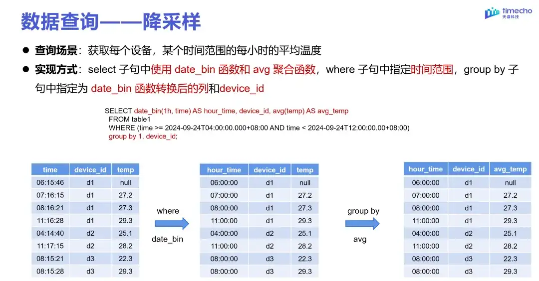 这里解释了一下 data_bin 和 avg 函数怎么样达到降采样的效果。如果我们需要获取所有设备某个数据时间范围内每小时的平均温度,也就是我不关注每一个设备内部了,我要关注整个表的概念,或者我关注更上一个层级的集团下所有设备总体的平均值,我在做的时候就不需要 group by device_id 了,规整之后有很多设备的 8 点钟数据就会被最后平均到一行上面了。
