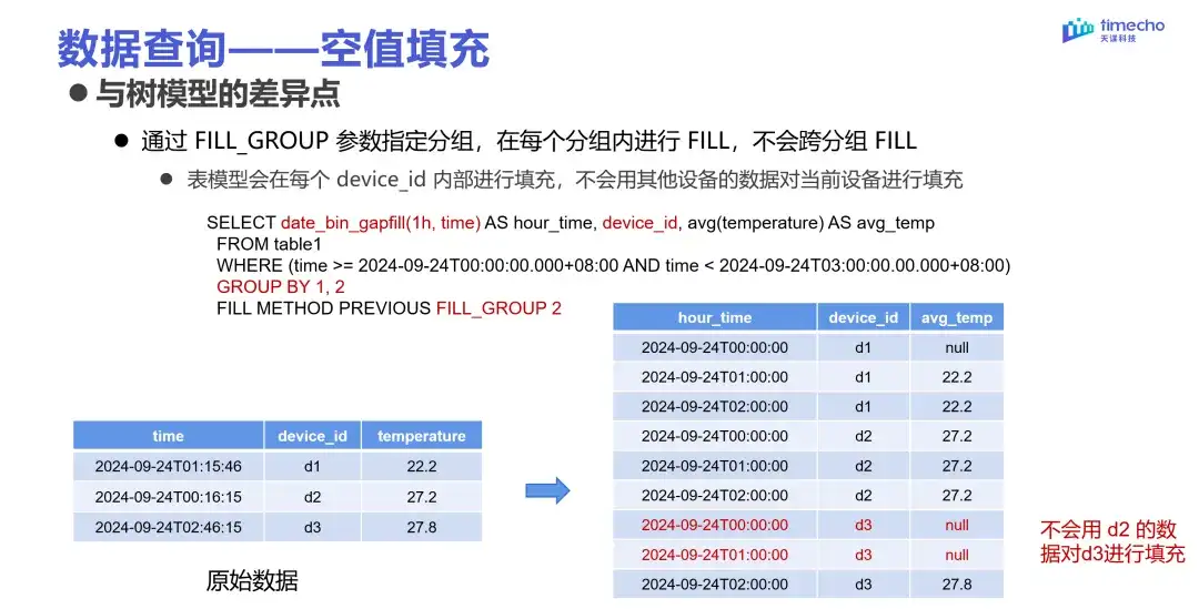 还有一个差异,树模型里面它分组内的 FILL 是针对结果集的,也就是 align by device 做填充的时候可能会错用前面的值,不会区分 d1/d2/d3,所以可能用 d2 的值去填充 d3 的数据。但是在表模型里面,你可以多指定一个分组内填充,也就是指定分组键在 device_id 相同的里面进行填充,如果 device_id 不相同就不能填充了。所以指定 FILL_GROUP 为 2 的时候,d3 的数据就不会用 d2 的数据填充了。这个也是我们对于 FILL 功能在表模型里面一个加强。