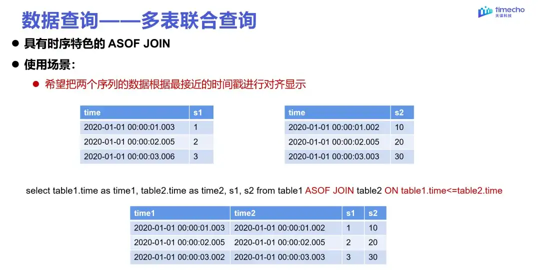 在关系型数据库标准代数定义的这四类之外,我们还会支持有时序语义特色的 ASOF JOIN。JOIN 其实就是多表的联合查询,当然也可以用这张表的子查询结果集和这张表的另外一个子查询结果集做表的自 JOIN。ASOF JOIN 是一个具有时序特色的 JOIN 方式,这个使用场景是什么呢?比如待分析的两个时间序列,采集频率是一样的,但是因为网络延迟或者上报误差等原因,两个序列的采集时间戳并不完全一致,会在一定时间范围内波动。那用户就希望把两个序列的数据根据最近的时间戳进行对齐显示,比如 s1、 s2 都是秒级采集的,但毫秒部分有一点点误差,用户想做的就是两个表的第一行、第二行、第三行接在一起,得到下表的结果。现有的四种 JOIN 方式都无法做到,因为只有一模一样的时间戳数据才会连在一起,而 ASOF JOIN 是可以做到这个效果的,可以写 table1 ASOF JOIN table2 ON table1.time ≤ table2.time,这样就能得到我们的预期结果了。
