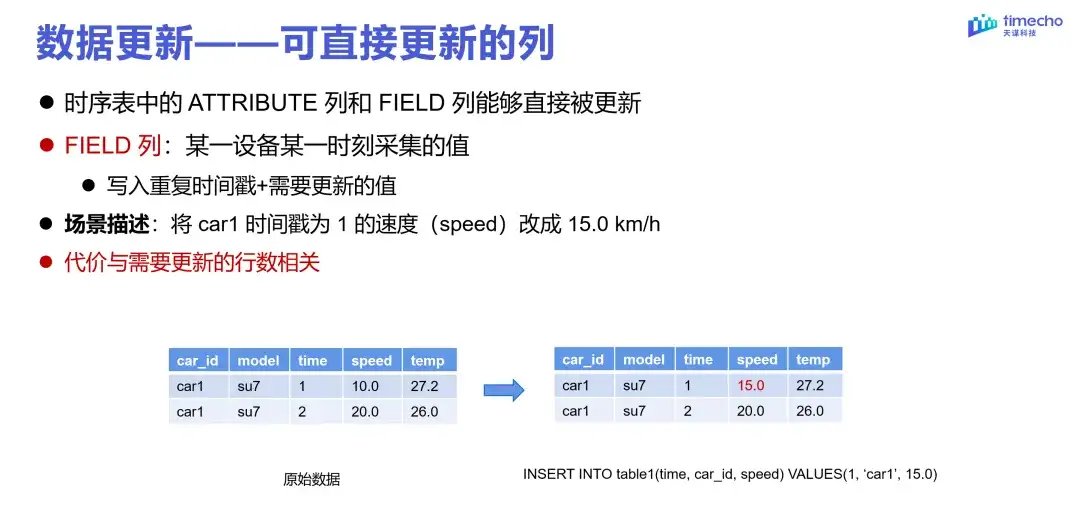 FIELD 列,就是某一设备某一时刻采集的值也是可以直接更新的,可以通过写入重复的时间戳和需要更新的值去做。比如我要去更新 car1 的时间戳为 1 的速度改成了 15 千米/小时,原来是 10 千米/小时,那我就直接 INSERT INTO table,指定 car1、我想要修改的时间和我想要修改的列的值为 15.0,它自动就更新掉了。当然这个修改的代价跟你更新的行数有关,你更新一行就相当于往数据库里面多插了一行,这个数据会变成乱序数据,可能会对查询性能产生一定的影响,但这个影响会随着 IoTDB 的合并进行消除。