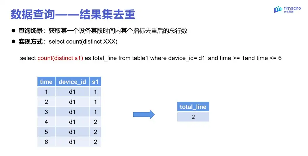 结果集去重也可以用 select distinct,比如想获得某一个设备某段时间内指标去重后的所有值,我们就可以写 select distinct s1 from,可以看到去重之后只剩下两行。distinct 遵循关系型数据库 SQL 的语法,它也可以用在 aggregation function 里面。我们想统计 s1 已出现不同值的有多少行,那就可以用 count(distinct s1)。同样,原来如果不写 distinct,有多少个非 null 值都会统计出来,写了 distinct 之后统计出来会是两行。