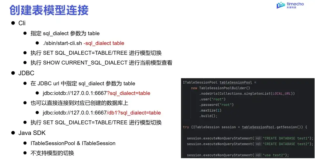 首先是创建表模型的连接,我们有 client,就是我们自己提供的命令行,还有 JDBC,还有 Java 的这些 SDK,那它们的指定方式分别是什么呢?就是刚刚也提到过的 -sql_dialect。我们是把 table 和 tree 作为两种视图、两种方言,去对同一个数据进行操作的,所以是通过 -sql_dialect table 的方式去指定连接用哪一个视图去看你的这份数据。这个参数是可选的,这是为了以前的树模型用户做兼容,因为以前树模型用户是不需要指定这个的,所以你不指定的话,我们还是默认为你是树模型用户,你只有指定了这个之后,你才是一个表模型用户。连进来之后,我们在 CLI 里面也可以执行 SET SQL_DIALECT=TABLE/TREE 进行模型切换,或者执行 SHOW CURRENT_SQL_DIALECT 去看当前的模型到底是树,或者当前的语法到底是树还是表。