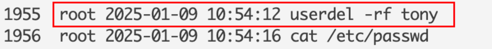 首先想到的是看 history 记录,入眼只看到一个删除用户 tony 的命令: