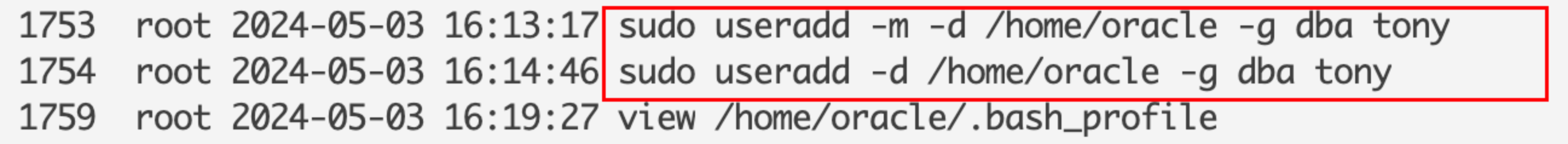 接着看,问题出在 tony 把 tony 用户删掉的时候加了 -rf,众所周知(当然不包括 tony),那么自然 tony 用户在被删除时,也就级联删除了 /home/oracle 目录。